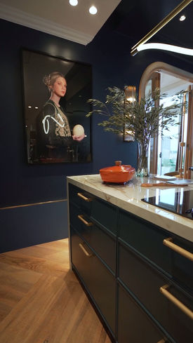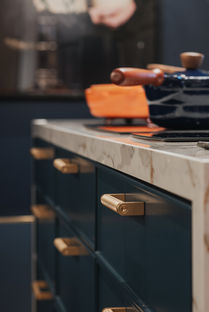 La Experiencia Living Distrito Quartier es una obra diseñada por la arquitecta Gabriela de C’est Moi, que combina estilo y funcionalidad en cada detalle. La cocina, laqueada en color azul con interiores también en azul, presenta un diseño moderno y sofisticado, con bisagras negras y guías Matrix gris oscuro. Las puertas con diseño de marco y los tiradores en dos modelos dorados añaden un toque de elegancia, creando un espacio único y contemporáneo que refleja la esencia de la modernidad.